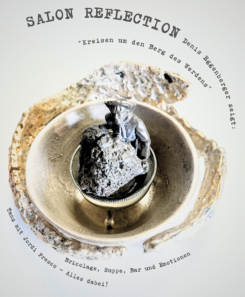Wie denken wir nach, über das Fühlen, das Handeln, das Sein? Wie nehmen wir wahr? Mit der Ausstellung «Kreisen um den Berg des Werdens» öffnet Denis Eggenberger seine Welt, die nicht nur unsere Wahrnehmung, sondern auch die Fähigkeit zur Reflexion über das eigene Erleben in den Mittelpunkt stellt. Gebaute Maschinen und Apparaturen werden zu Vehikeln einer Traumreise, die Gedanken und Gefühle in greifbare Formen verwandeln. Er kombiniert verschiedene Geräte zu einem begehbaren Gedankenmodell, das die Grenzen zwischen Traum und Wirklichkeit verschwimmen lässt. Treten sie ein - Gute Reise!